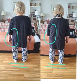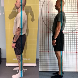 Das bin ich . Am rechten Bild erkennt man sehr gut die nach vorne geschobene Hüfte und das daraus resultierende Hohlkreuz. Auch der Kopf war vom Schwerpunkt nach vorne verschoben und die Knie waren zu gestreckt. Am Bild rechts hatte ich Schmerzen auf einer Skala 8 von 10, auf dem linken Bild 2 von 10 wobei 10 das Maximum ist.